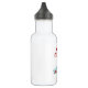 Uma garrafa de água com uma imagem digital de uma ilustração pintada de uma igreja vermelha e uma torre. Uma estrela de Natal brilhante brilhando. Famílias à frente chegando para uma igreja. A neve de inverno cobrir o chão e repousa em pinheiros fofos. Feliz de Natal escrito em uma fonte vermelha de tendência.