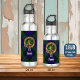 Crachá da crista Clan Gunn rodeado por uma correia e fivela sobre fundo tartano. Texto personalizado.