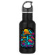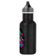Arte neon colorida com cogumelos e flores azuis e cor-de-rosa e um fundo preto.
