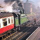 Um comboio a vapor e as carruagems de uma era passada, que foram restaurados de forma magnífica, deixando a estação de comboios e o maquinista entregando a chave antes de ser autorizado a prosseguir ao longo do caminho de ferro. Inglaterra Reino Unido.