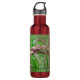 Uma macrofotografia de uma flor de grama salpicada com gotas de água, as sementes tornando a ponta roxa contra um fundo de verde rico. Enquadrando a foto há um mosaico de vidro do campo ao seu redor.
