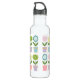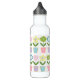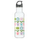 Rows of pastel colored flowers in flower pots. Cute design on water bottle.
