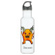 Garrafa personalizada com uma garrafa d'água com um desenho de tinta de uma criatura demoníaca amarela, com chifres sorrindo alegremente e mostrando seus dentes agudos e nome personalizável.
