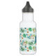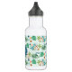 Uma garrafa de água de dinossauros legal e personalizada apresenta um padrão de Tyrannosaurus (T rex), Tricerátops, folhas de monstera tropical, palmeiras, vulcão, ossos e texto "Roar!" sobre fundo azul-claro. Perfeito para crianças adoráveis, de volta à escola, esportes e diversão de verão. Estoque da KL original