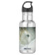 Uma garrafa de água personalizada com uma fotografia serena com um belo cavalo branco com um pequeno pássaro no pescoço. Uma queda mágica de neve no inverno dá à imagem uma qualidade mística maravilhosa.