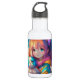 Linda menina Anime com dois olhos coloridos diferentes segurando um filhote adorável. As cores utilizadas são cor-de-rosa, laranja, azul, roxo e azul. Arte "Ai" de crianças bonitas e coloridas.