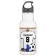 Camisa branca e preta personalizada do jérsei de futebol do futebol, pendurando em um vestuário dos esportes com uma garrafa de água, os grampos do futebol e uma bola de futebol. Apenas adicione o nome e o número (ou a idade) do jogador de futebol, treinador do fan de futebol ou da equipe de futebol para criar um presente original do futebol.