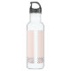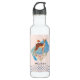 Uma garrafa de água personalizada com um veado castanho bonito com uma mancha branca. Um passarinho sentado nas costas do veado. Um buquê floral rico com rosas de aquarelas e folhas verdes-oliva claras sob os pés dos veados. Um retângulo de aquarela azul atrás da imagem. Uma fronteira bolinhas ao longo do fundo. Inocente e doce design com elegância rústica. Pêssego fundo colorido.