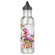 Uma garrafa de água com uma fotografia espantosa do pássaro mais bonito empoleirado num galho coberto de flores cor-de-rosa e folhas verdes. O pássaro tem uma cabeça azul e corpo amarelo com um rosto muito doce. Adorável.