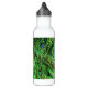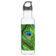 Penas próximas de um Pavão em uma garrafa de água. Tome um pouco de natureza com você nas suas viagens.