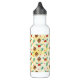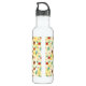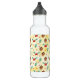 Garrafa de água com um padrão fofo, com cones de pínus e holly sobre fundo de aquarela amarela com pequenos círculos brancos espalhados por aí.