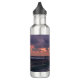 A luz do sol a desaparecer criando lindas matizes cor-de-rosa e laranja no céu, silhuetas fazeres das palmeiras e realçando o surf suave. Cena de praia tranquila.