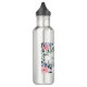 Garrafa de água com um design floral bonito feito com aquarelas. Flores cor-de-rosa, roxas e verdes jardins.