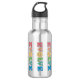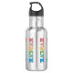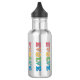 Garrafa de água promotora da paz. O design é feito de letras coloridas que escrevem evoluir com a letra O substituída por um símbolo de paz redondo. Essas garrafas são decorativas e ajudam a promover a paz e a avançar do ódio e das guerras para a paz ao nosso redor e no mundo como um todo.