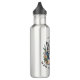 Gato de brindle de cinza de aquarela, cômoda, rodeado de flores rosa e azuis.