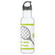Garrafa de água de tênis e aço-esfera que mostra uma raquete de cinza, uma bola de tênis verde e seu texto sobre fundo branco com borda verde. Este design é um modelo e é completamente personalizável. Personalize-o e adicione o texto "Melhor tênis player" ou monograma, nome ou mensagem. Alguns elementos são cortesia de vectorportal.com.