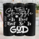 Esta é uma design gráfica com uma frase espiritual numa letra estilizada, branca, desenhada à mão. O texto é colocado sobre um fundo simples e leve de cinzas. A frase diz, "A Luta É Real, Mas Deus Também," com as palavras organizadas verticalmente e separadas por pequenos símbolos em forma de estrela. A design global tem uma estética minimalista e reconfortante,