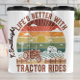 Esta é uma design gráfica rústica com um tema de fazenda. A imagem central apresenta um trator clássico num campo arado com cerca de madeira e feixes de trigo. Um celeiro e moinho de vento são visíveis à distância. O fundo é um pôr do sol vibrante com raios de sol em várias cores. A frase "A LIFE'S BETTER WITH TRATOR RIDES" aparece de forma destacada, acima e abaixo da cena, em caracteres negros e meteorológicos.