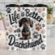 Esta ilustração gráfica apresenta um dachshund bonito e encantador no centro, olhando diretamente para o observador. Ao redor do cão estão as palavras "A vida é melhor com um Dachshund" em uma fonte ousada e brincalhona. O design inteiro é enquadrado por uma variedade de estampas castanhas, cinzas e pata preta, dando-lhe uma sensação divertida e moderna.