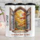 Este gráfico representa uma janela aberta e arqueada com uma estrutura de pedra. Além da janela está uma vista cênica de árvores na folhagem do outono de cheio com as vibrantes folhas amarela, laranja e vermelha. As palavras "Abrir seu coração para ele" são escritas abaixo da imagem em uma fonte quente e escrita à mão.