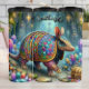 Esta é uma ilustração brilhante e vibrante de um tatu com uma casca feita de joias e joias multicoloridas, explorando uma caverna mística. O tatu é cercado por cristais cintilantes e rochas. O fundo apresenta entalhes intrincados e uma passagem brilhante que vai mais fundo na caverna mágica. Um tórax do tesouro é visível na parte inferior direita, acrescentando um senso de fantasia e aventura.