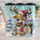 Esta ilustração engraçada mostra uma rena cansada vestindo um chapéu de Papai Noel, com uma corda de luzes enredada em suas galhadas. Ele segura uma caneca de café que diz 'SNOW OFF', e uma placa atrás dela diz 'NOT JOLLY ANTES DO CAFÉ.' A cena, completa com um grande despertador, captura o humor de feriado relacionado à necessidade de cafeína.