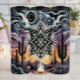 Esta ilustração estilizada apresenta uma estrela grande e brilhante, como a mandala, com padrões intrincados no seu centro. O fundo é um céu noturno com nuvens estilizadas, olhos, e formas cósmicas em roxo e laranja. No primeiro plano, silhuetas pretas de saguaro cactos, uma tenda pequena, e uma fogueira completam a cena mística do deserto, misturando motivos tribais e espirituais.