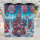 Esta ilustração vibrante e caprichosa representa uma paisagem festiva de inverno cheia de árvores de Natal brilhantemente coloridas. As árvores e o céu estão enfeitados com padrões intrincados, ornamentados de rajadas e semelhantes a mandala, criando uma cena mágica e detalhada de feriado. É uma peça de arte colorida e festiva.