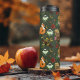 Raposa vermelha, coelho, coruja, folhas, mariposa-luna, marten-pinheiros com folhas de outono, abóboras, flores e bolotas num pano de fundo verde profundo