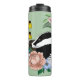 Um texugo preto e branco giro sentado entre flores e cogumelos silvestres em pano de fundo verde-sábio