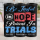 This inspiring design beautifully presents Romans 12:12. "Be Joyful" in elegant blue script contrasts with "HOPE" in a bold, distressed red. "Patient In" flows gracefully, while "TRIALS" stands out in a playful blue font, making it a powerful reminder of enduring faith.