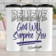 This uplifting white graphic features the encouraging message, "BELIEVE God WILL Surprise You," in varying fonts and shades of grey and purple. It's a powerful affirmation of faith, encouraging trust in divine timing and blessings. Perfect for inspiring hope and reminding believers that God's plans often exceed expectations with joyful surprises.