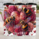 Três mamangabas lindamente detalhadas com asas iridescentes pairam sobre um pente de mel central, texturizado em forma de coração, inscrito com "Abelha Mina". Essa design vibrante e romântica é colocada contra um pincel de rosas vermelhas e rosa, intercaladas com pequenos cardíacos. É uma ilustração doce, afetuosa e visualmente rica perfeita para um cambaleão.