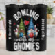 Este gráfico branco apresenta dois gnomos encantadores, cada um segurando uma bola de boliche, com pinos de boliche atrás deles. A design inclui o texto lúdico "BOLICHES com meus GNOMIES" e pequenos corações e estrelas, criando uma ilustração divertida e amigável perfeita para uma reunião social.
