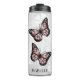 Aproveite qualquer bebida enquanto estiver em viagem com um Tumbler térmico personalizado floral personalizado com borboleta rosa. O design do Tumbler apresenta um par de borboletas vibrantes que repousam sobre uma vinha floral branca contra um fundo de nuvens de cinza clara. Itens de presentes adicionais disponíveis com este design, bem como uma variedade de cores.