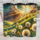 Esta imagem é uma ilustração vibrante e etérea de um campo verde-rolante e amarelo pontilhado com inúmeras cabeças brancas de dandelion. Um poderoso sol ouro brilha intensamente do alto à direita, lançando raios de luz dramáticos e iluminando nuvens fluffy. Espalhados por toda a cena estão a borbulhar speck de luz, dando a impressão de magia ou de vagalumes, melhorando a qualidade sonhadora da paisagem.