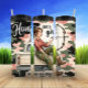Uma mulher alegre com rabo de cavalo, vestida com uma camisa de xadrez e calças de camo com sotaques de folha, senta-se brincalhão no portão de um caminhão branco. Ela segura um arco e uma seta, incorporando a frase "Caça COMO UMA MULHER E OLHA BONITA FAZENDO" gravada em um fundo de camuflagem. O estilo geral é caprichoso e poderoso.
