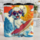 Esta ilustração estilizada apresenta um cão feliz com óculos de sol surfando em um conselho vermelho. Uma grande onda cai atrás dela sob um sol brilhante e sorridente. A arte tem uma sensação vibrante, ousada e enérgica, com tom lúdico e uma estética retrô clássica.