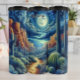 Esta ilustração mística representa um caminho arenoso enrolamento que atravessa uma paisagem desértica cheia de vários cactos e plantas do deserto. Formações de rochas em direção a um lado sob um dramático céu noturno com uma lua de cheio brilhando intensamente em meio a nuvens em espiral e numerosas estrelas.
