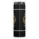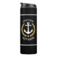 Uma garrafa térmica personalizada com sua classificação de Capitão ou outro título e seu nome de barco, nome de família ou outro texto desejado. Apresentando uma âncora náutica, folhas de ouro e emblema de estrela, desenhadas por medida, a preto. Altere facilmente a cor do plano de fundo para corresponder ao seu decoro ou tema atual. Faz um presente excelente para qualquer ocasião.