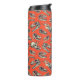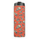 Este tumbler térmico apresenta crânios de dinossauros ilustrados manualmente em azul-marinho e creme em um fundo vermelho-alaranjado brilhante.