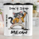 Este gráfico engraçado mostra um gato de desenho vestido como uma famosa estrela do rock numa jaqueta amarela, tocando uma pose com um microfone. O design inclui o slogan "Não Pare o MEOW", fazer que seja um tributo inteligente e humorístico à música e aos felinos.