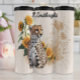 Esta ilustração estilizada apresenta um guepardo olhando sobre seu ombro, com grandes e brilhantes girassóis em primeiro plano. A arte tem um estilo de aquarela, com texturas de tinta espalhadas e um fundo bege macio. O sentimento geral é de calma e beleza natural, combinando a vida selvagem com um delicado design floral.