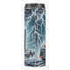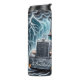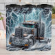Esta imagem mostra um poderoso caminhão semirplado por cromo que desceu em uma autoestrada durante uma tempestade de raios feroz. Pinos amarelados de luz branca e azul brilhante eletrificam a nódoa negra e tempestuosa que rodeia o caminhão. A água incorre ao redor do veículo à medida que ele se move, enfatizando a intensidade do tempo e a forte presença do caminhão.