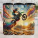This vibrant artwork features a motocross rider airborne, leaving a spectacular trail of rainbow-colored streaks against a warm sunset and stylized landscape. It's a dynamic and imaginative fusion of extreme sports and expressive art, perfect for thrill-seekers, art enthusiasts, or anyone who loves bold colors and unique, energetic designs.