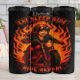 Esta imagem apresenta uma ilustração estilizada de uma motocicleta fêmea com cabelo e óculos vermelhos, conduzindo uma moto vermelha e rodeada por chamas laranja vibrantes. As faixas acima e abaixo da imagem central indicam ousadamente "EAT SLEEP RIDE" e "RIDE REPEAT", capturando a paixão do estilo de vida do motociclista. O trabalho de arte tem um gibi ou um estilo de tatuagem.