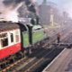 Um comboio a vapor e as carruagems de uma era passada, que foram restaurados de forma magnífica, deixando a estação de comboios e o maquinista entregando a chave antes de ser autorizado a prosseguir ao longo do caminho de ferro. Inglaterra Reino Unido.