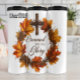 Este gráfico apresenta uma coroa de espinhos torcidos em uma coroa rústica com folhas de bordel laranja e vermelho. Uma cruz de madeira fica no centro da coroa. O texto "Crowned with Sua Glória" está escrito em um roteiro elegante e fluente, transmitindo uma poderosa mensagem religiosa.
