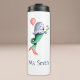 Este é o presente perfeito do professor. Tem uma coruja trazendo presentes, um balão e uma flor. A coruja é única, como seu professor, ela tem uma cauda de sereia. E o texto é personalizável. Adicione uma mensagem personalizada clicando em personalizar mais adiante. Ilustração de Patricia Alvarez.