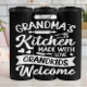 Este gráfico encantador celebra o calor da família com a frase convidativa "GRANDMA'S Kitchen FEZ WITH LOVE NETOS Welcome" em letras brancas nítidas contra um fundo preto. Ícones encantadores de cozinha, incluindo um pino rolante, uísque, espátula e faca, estão integrados. Os corações significam afeto, criando um design para o espaço de cozinhar de uma vovó.